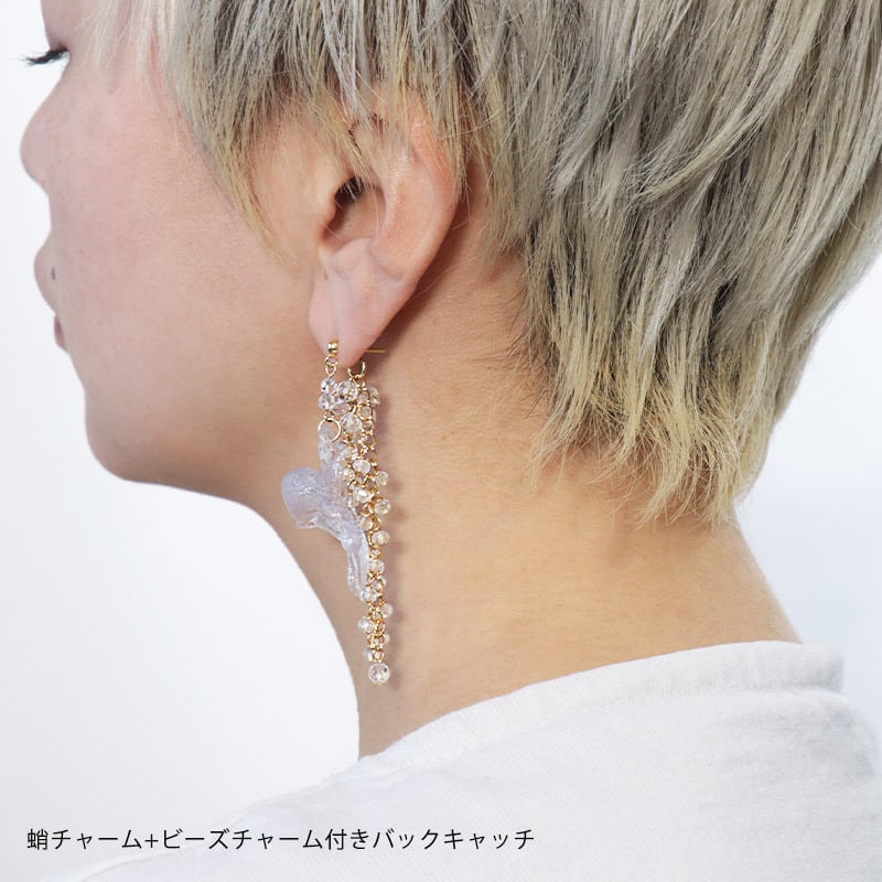 透明にこだわる事で推し(イカタコ)のフォルムは曖昧になり、そこにビーズチャームでオシャレ感をプラス。推しをちょっとだけアピールしたい時はチャームを別にすれば・・”よく見たら”推しのピアスです!