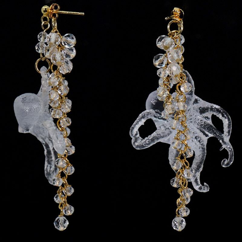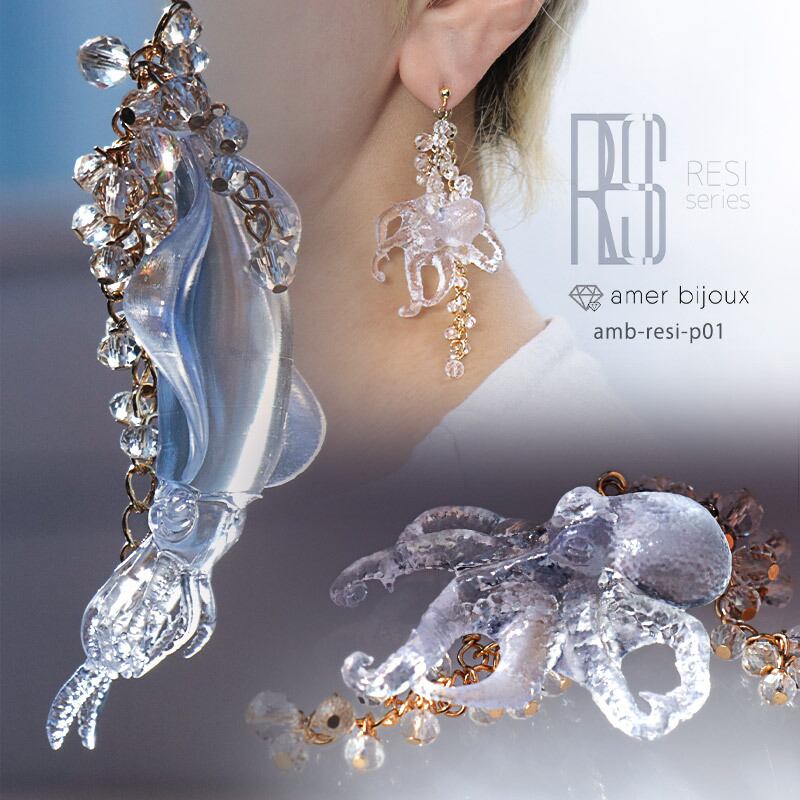 【BASE】蛸 烏賊 頭足類 ピアス / 透明 クリア 涼し 氷 水 水晶 ファイアーポリッシュ 硝子 チャーム ちゃらちゃら / レジン オリジナルデザイン / イカ いか タコ たこ / amb-resi-p01 / AmerBijoux / resi | amerbijoux