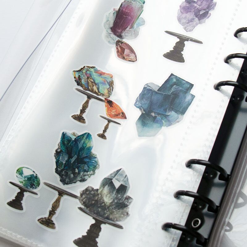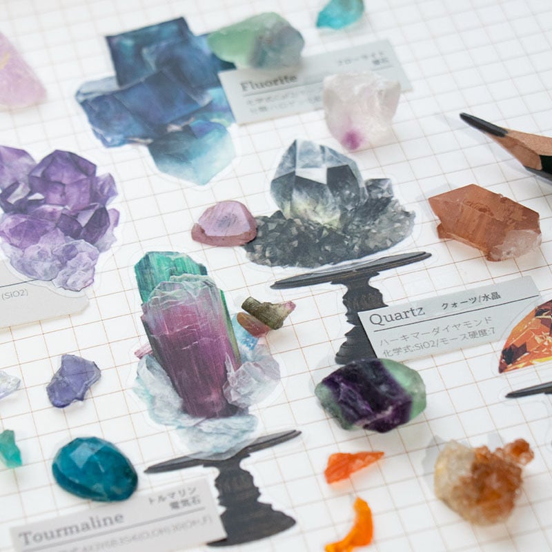 石の美しさや特性をリアル調イラストで表現。デコレーションや手帳、お好きなアイテムに貼るだけで自分だけのミネラルコレクションを作っていただけます。台座シールは使い方アイディア次第!台紙には石の説明文がついています。
